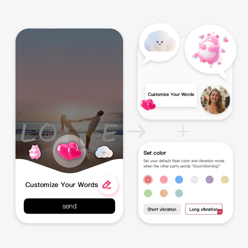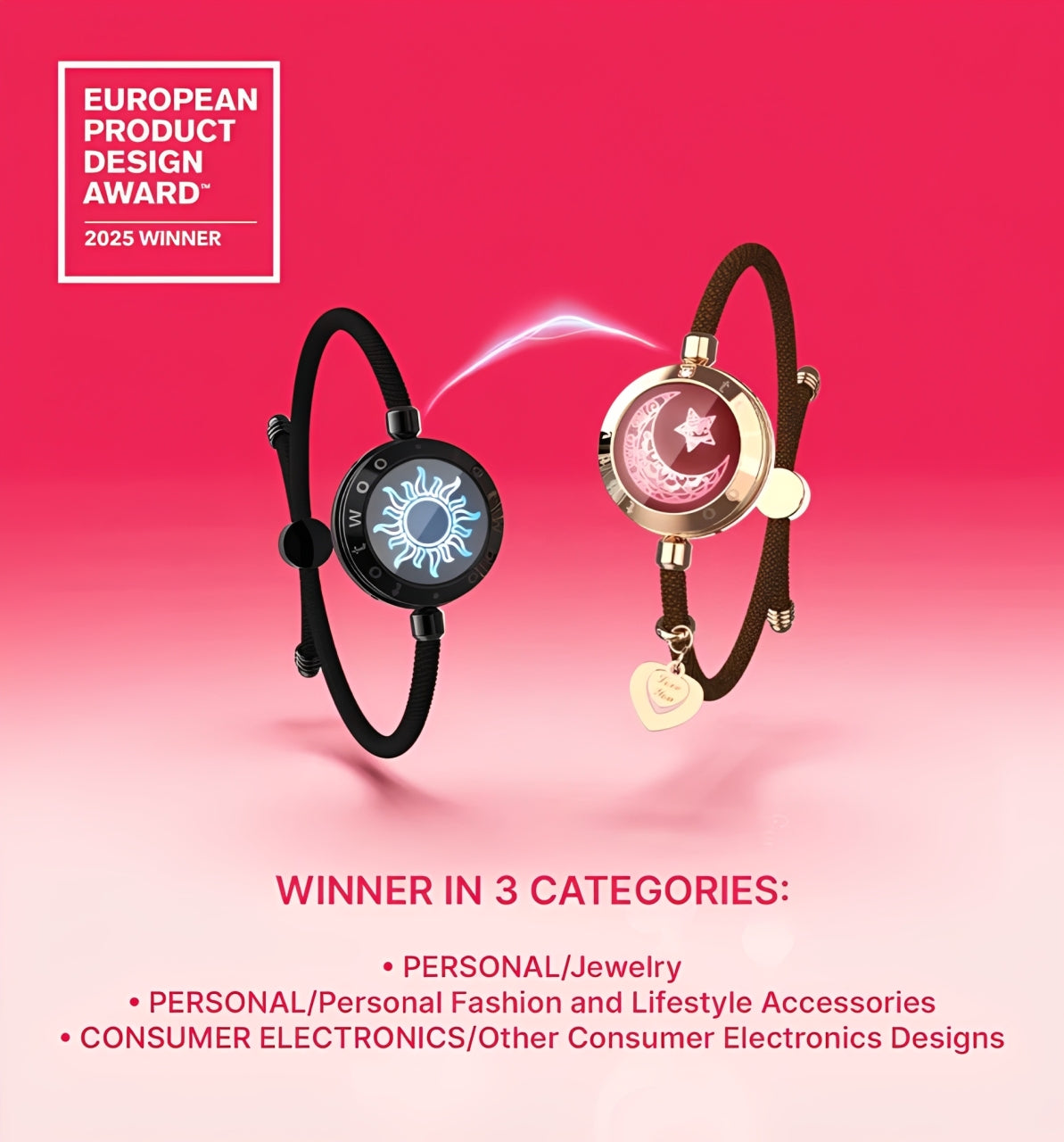 Connected to the Totwoo app via Bluetooth, the bracelets let you turn any message into a unique signal — with customizable flash colors and vibration patterns to say "I miss you," "Hug," or any special code you create.